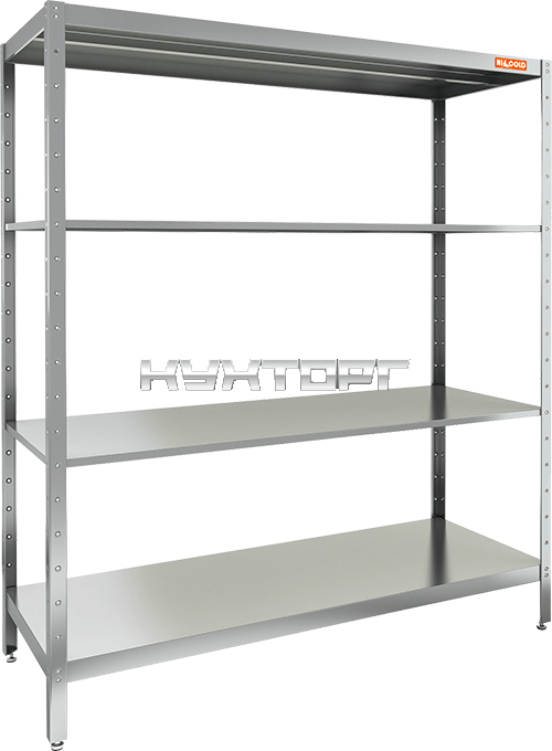 полки - сплошные; 4 полки; от 50 до 100 кг; каркас - оцинкованная сталь; полки - нерж. сталь; ширина - 1400 мм; глубина |