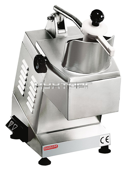 Овощерезка Angelo Po STV с одной скоростью вращения дисков. Корпус овощерезательной машины изготовлен из анодированного алюминия. Бункер подачи овощей имеет одно D-образное отверстие. Крышка отсека нарезания откидная. Есть диск-сбрасыватель.