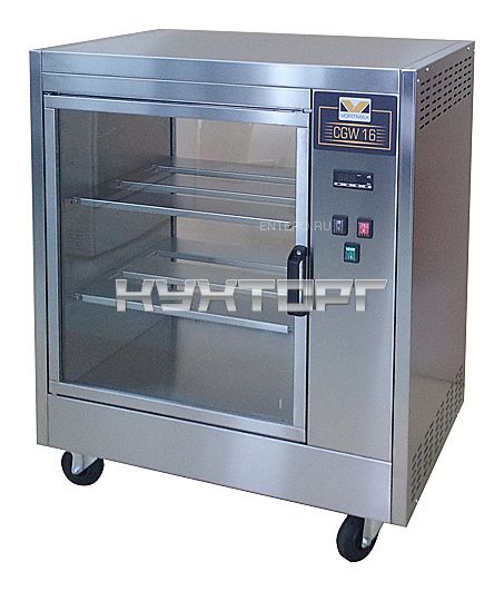 Тепловая витрина Vortmax CGW 16 предназначена для демонстрации и поддержания куриц-гриль в горячем состоянии на предприятиях общественного питания и торговли. Корпус выполнен из нержавеющей стали.