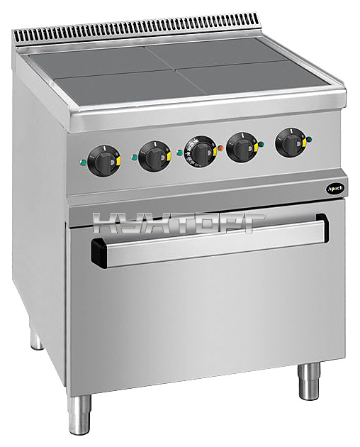 Электрическая плита Apach APRE-77QFE 700-й серии предназначена для приготовления различных блюд из мяса, птицы, рыбы и овощей в наплитной посуде на предприятиях общественного питания и торговли. Модель оснащена электромеханической панелью управления, быстро нагревающимися конфорками, гидроизолированной прессованной поверхностью и регулируемыми по высоте ножками. Корпус, рабочая поверхность, панель управления и вытяжная решетка выполнены из нержавеющей стали AISI 304, боковые и задняя панели - из нержавеющей стали AISI 430.