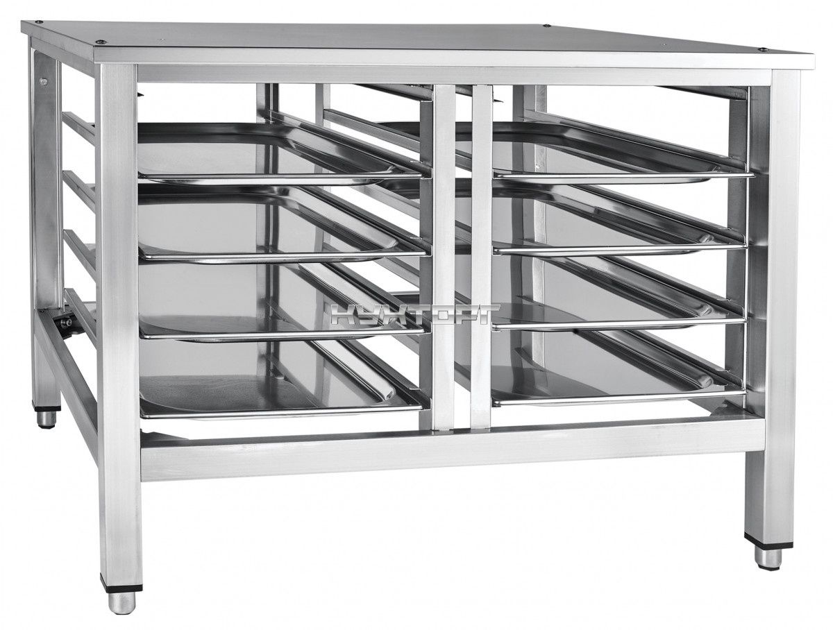 Основные характеристики: - сварная конструкция повышенной жесткости из прямоугольных и квадратных труб; - крепление к стене (уголки); - крепление к полу (штатные места под крепление к полу каждой ножки); - направляющие специальной формы, предотвращающие самопроизвольное выкатывание гастроемкостей при качке; - штатные места крепления пароконвектомата к подставке; - полностью из нержавеющей стали AISI 304; - регулируемые по высоте ножки. Поставляется в собранном виде.