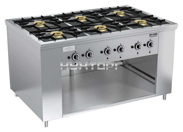 Газовая плита Вулкан ПРГ-IIA-6 Maxi предназначена для приготовления первых, вторых и третьих блюд в наплитной посуде на предприятиях общественного питания и торговли. Модель оснащена газ-контролем, пьезорозжигом и запальной горелкой. Корпус выполнен из нержавеющей стали, решетки - из чугуна, газовые горелки - из латуни.