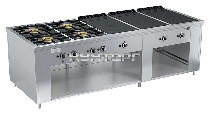 Газовая плита Вулкан ПРГ-IIA-10-3 Maxi предназначена для приготовления первых, вторых и третьих блюд в наплитной посуде на предприятиях общественного питания и торговли. Модель оснащена 4 секционными и 3 сплошными горелками, газ-контролем, пьезорозжигом и запальной горелкой. Корпус выполнен из нержавеющей стали.