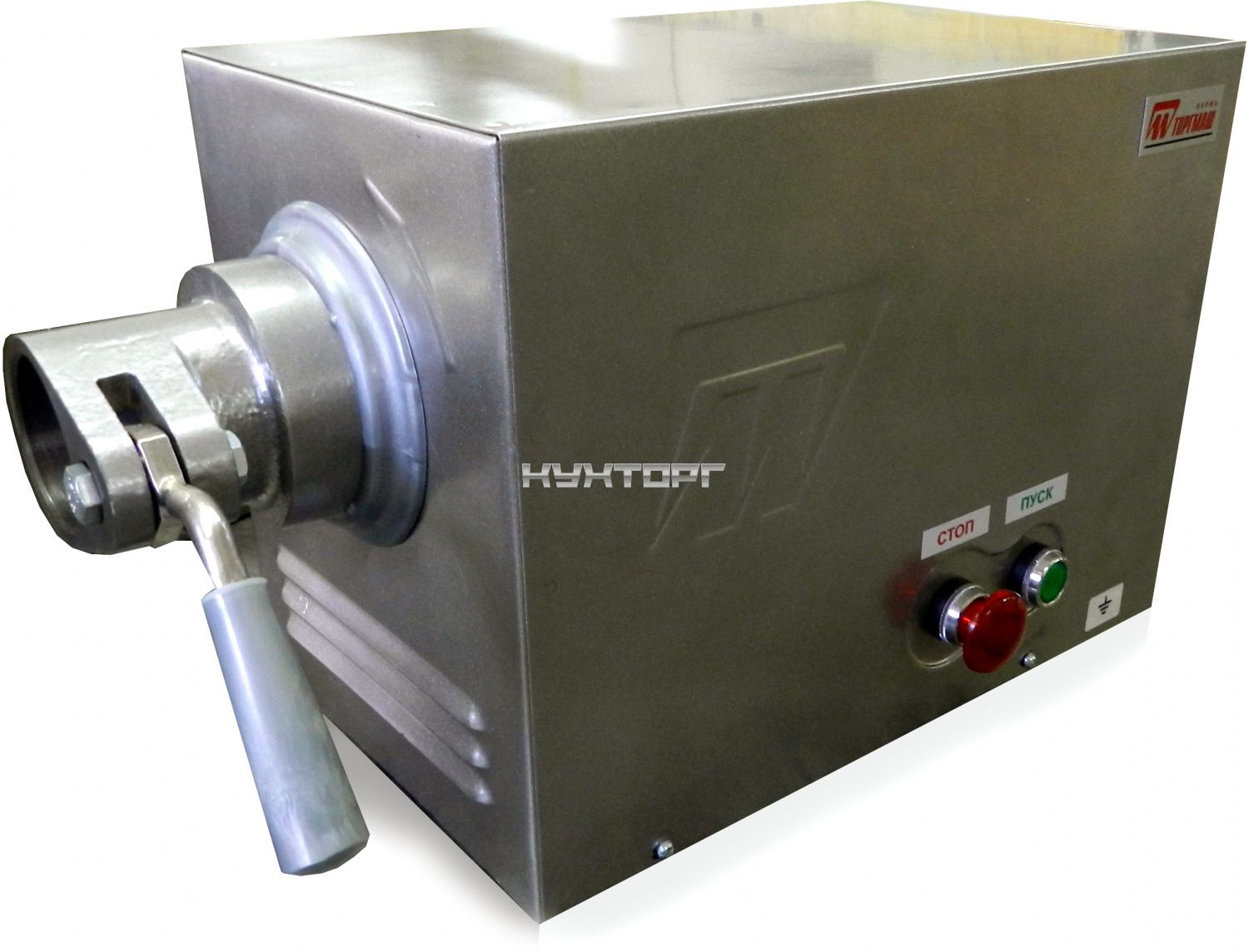 Насадка ТОРГМАШ ПМ используется совместно с универсальной кухонной машиной для приведения в действие отдельных сменных механизмов. Модель состоит из редуктора, электродвигателя, пульта, рамы, кожуха и рукоятки.