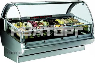Витрина для мороженого ISA Gelatoshow 2 220 RV используется на предприятиях общественного питания и торговли для демонстрации и хранения мороженого, сорбета и йогурт-мороженого. Каркас изготовлен из углеродистой стали, окрашенной порошковой краской, дно зоны выкладки - из полированной нержавеющей стали, задняя панель - из пластифицированной стали и контейнеры - из прозрачного полиуретана. Цельный корпус имеет изоляцию из пенополиуретана, вспененного углекислотой, без использования озоноразрушающих веществ.