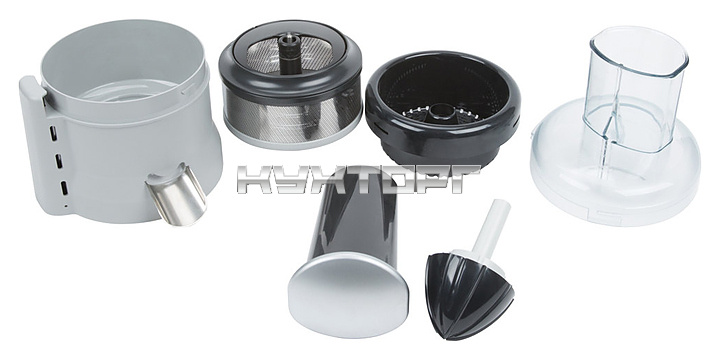 В комплект поставки входят насадка для приготовления соусов и пюре и насадка-сововыжималка для цитрусовых.