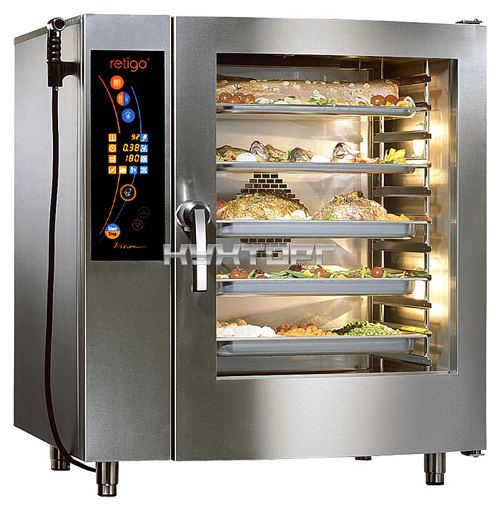 Пароконвектомат Retigo O1011IC VISION II серии Orange Vision II предназначен для обжаривания, приготовления на пару, бланширования, запекания и других видов тепловой обработки продуктов на фабриках-кухнях, предприятиях общественного питания и торговли. Оборудование заменяет сразу несколько видов приборов: плиту, конвекционную печь, жарочный шкаф, духовку, опрокидывающуюся сковороду, пищеварочный котел и фритюрницу. Приготовленные в пароконвектомате блюда сохраняют все полезные вещества. Модель оснащена сенсорной панелью управления.