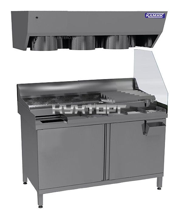 Мармит КАМИК МФ-40181 используется на предприятиях общественного питания и торговли для кратковременного хранения, демонстрации, поддержания в теплом состоянии и последующей фасовки готового картофеля фри. Модель оснащена распашными дверями, осветительным коробом, колесами, пакетодержателем и навесным карманом. Столешница выполнена из нержавеющей стали AISI 430 толщиной 1,5 мм, корпус и остальные части изделия - из нержавеющей стали AISI 430 толщиной 1 мм.