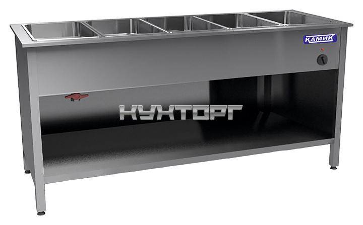 Мармит КАМИК МУ-18570 используется на предприятиях общественного питания и торговли для кратковременного хранения, демонстрации и поддержания в теплом состоянии супов, гарниров, вторых блюд и соусов. Модель оснащена ванной с 4 делителями и полкой-дном. В правой части закрытой с 3 сторон конструкции расположен термостат, позволяющий регулировать температуру. Корпус выполнен из нержавеющей стали AISI 430.