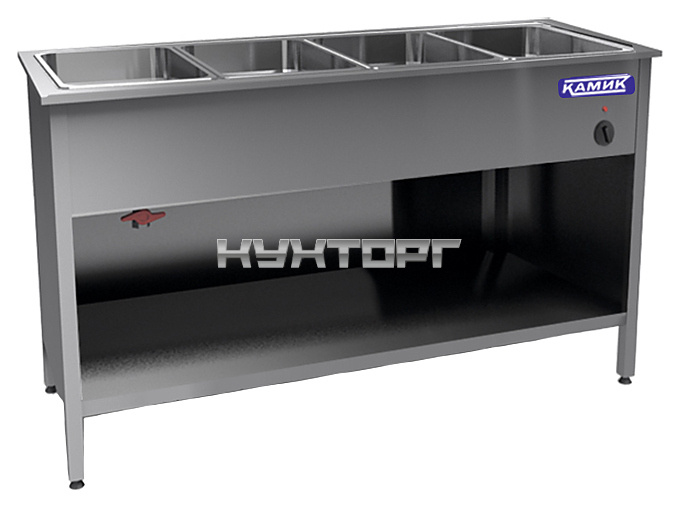 Мармит КАМИК МУ-15070 используется на предприятиях общественного питания и торговли для кратковременного хранения, демонстрации и поддержания в теплом состоянии супов, гарниров, вторых блюд и соусов. Модель оснащена ванной с 3 делителями и полкой-дном. В правой части закрытой с 3 сторон конструкции расположен термостат, позволяющий регулировать температуру. Корпус выполнен из нержавеющей стали AISI 430.
