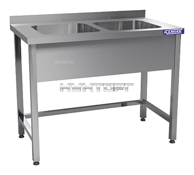 Моечная ванна КАМИК ВМ-2-42137 используется на предприятиях общественного питания и торговли для мойки посуды, овощей и фруктов. Сварной каркас выполнен из нержавеющей стали AISI 430 толщиной 1 мм, столешница и цельнотянутая емкость - из нержавеющей стали AISI 304 толщиной 1,5 мм.