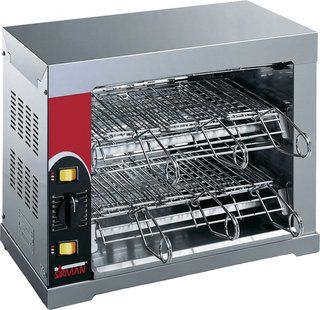 Тостер Sirman 12Q используется на предприятиях общественного питания и торговли для приготовления тостов, подогрева пиццы, полуфабрикатов и бутербродов, а также приготовления сосисок, гамбургеров, пресных лепешек "пьядина" и тостов с начинкой. Модель оснащена кварцевыми нагревательными элементами и удаляемой ванночкой для сбора остатков.