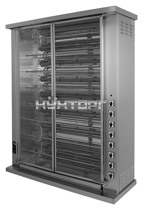 Гриль для кур Grill Master Ф8Ш1Э используется на предприятиях общественного питания и торговли для приготовления тушек кур, куриных окорочков, грудок и других продуктов. Модель оснащена подсветкой. Корпус и шампуры выполнены из нержавеющей стали, дверь - из стекла.