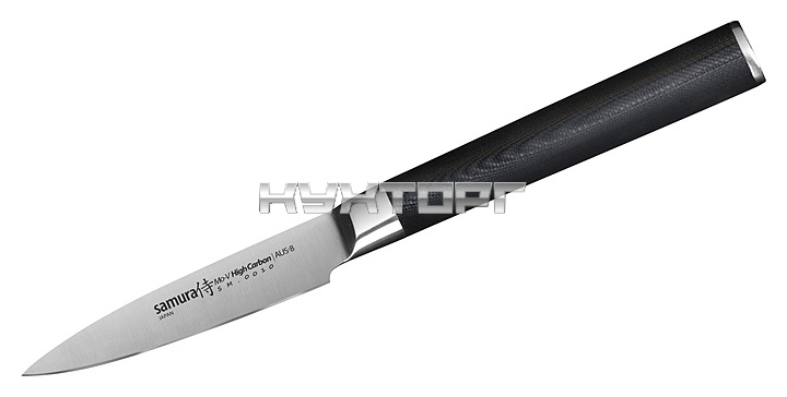 Японский кухонный нож Samura Mo-V SM-0010/K предназначен для чистки и нарезки овощей и фруктов на предприятиях общественного питания и торговли, в частных домах и квартирах. Небольшой клинок имеет тонкое острие и очень небольшой вес. Лезвие выполнено из коррозионно-стойкой однослойной стали AUS-8, ручка - из стеклоткани G-10.