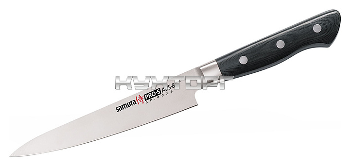 Японский кухонный нож Samura Pro-S SP-0023/K предназначен для нарезки различных продуктов на предприятиях общественного питания и торговли, в частных домах и квартирах. Безупречная острота режущей кромки и анатомически выверенная рукоять делают нож надёжным и эффективным помощником на кухне. Лезвие выполнено из коррозионно-стойкой однослойной стали AUS-8, ручка - из стеклоткани G-10.