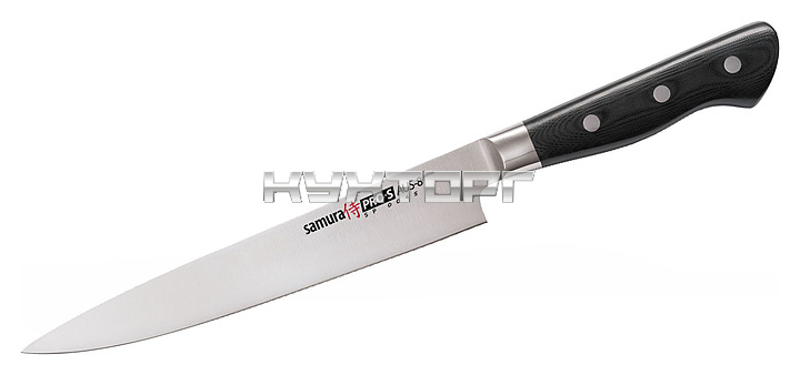 Японский кухонный нож Samura Pro-S SP-0045/K предназначен для нарезки различных продуктов на предприятиях общественного питания и торговли, в частных домах и квартирах. Безупречная острота режущей кромки и анатомически выверенная рукоять делают нож надёжным и эффективным помощником на кухне. Лезвие выполнено из коррозионно-стойкой однослойной стали AUS-8, ручка - из стеклоткани G-10.