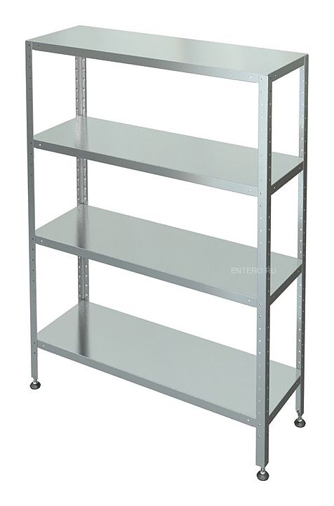 Стеллаж Марихолодмаш С-4-0,5/1,0/1,8 предназначен для хранения кухонного инвентаря и упакованных пищевых продуктов с целью увеличения полезного пространства помещений в моечных отделениях, складских помещениях и в холодильных камерах на предприятиях общественного питания и торговли. Полки выполнены из нержавеющей стали, стойки - из оцинкованного стального уголка, ножки с регулиремыми опорами - из оцинкованного стального уголка 40х40 мм с подгибом краёв во внутрь толщиной 1 мм.