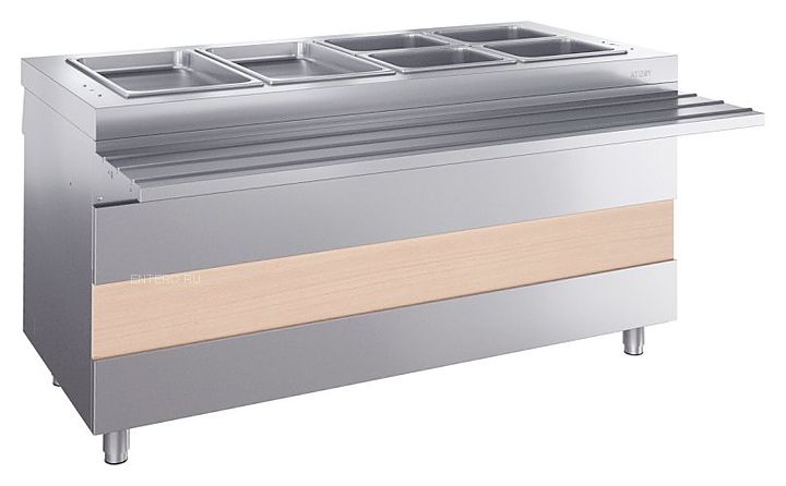 Мармит ATESY Ривьера М2-1500-02-ПО используется в составе линии раздачи Ривьера на предприятиях общественного питания и торговли для поддержания в горячем состоянии гастроемкостей со вторыми блюдами, гарнирами и соусами. Модель оснащена герметичной ванной для размещения гастроемкостей и терморегулятором, позволяющим осуществлять настройку температуры нагрева гастроемкостей. Столешница выполнена из нержавеющей стали AISI 430 и усилена листом ламинированной ДСП толщиной 16 мм, ванна - из нержавеющей стали, ножки - из нержавеющей стали и пластиковой опорной части.