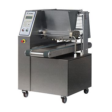 Эта модель машин предоставляет возможность работать с густыми тестами (курабье, овсяное печенье, миндальное, кокосовое), жидкими (бисквит, безе, магдалены), а также с твердыми тестами типа пряничного для производства резанных нитью изделий. Корпус машины выполнен полностью из нержавеющей стали. Основные рабочие функции: вариатор скорости, компьютер на 99 программ, позволяющий устанавливать тип дозировочной головки, вес, форму изделия, количество рядов на противне, скорость вращения валков, высоту поднятия стола для отделения заготовок, приспособление, предотвращающее капание теста, привод вращения насадок для печенья типа "колечко", приспособление резки нитью, автоматическое продвижение противней, автостарт, вертикальное опускание-поднятие стола для отделения заготовок. С вариатором скорости вращения валков. Производительность 110 кг/час. Количество отсадок в мин. 25. Ширина противней 400 мм.