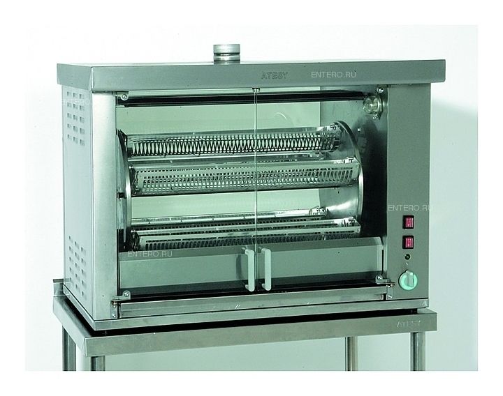 Время приготовления составляет 50-60 минут. Стеклянная дверь оснащена механическим доводчиком. Температурный диапазон от 50°C до 250°C поддерживается терморегулятором гриля. Равномерность тепловой обработки обеспечивается вращением всех четырех садков с курами.