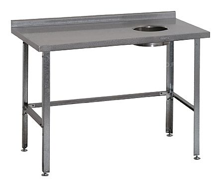 Стол для сбора отходов ATESY СРО-3/1200 с отверстием справа используется на предприятиях общественного питания и торговли. Каркас выполнен из оцинкованной стали толщиной 1,2 мм, столешница толщиной 40 мм - из нержавеющей стали AISI 430 толщиной 0,8 мм, усилена подложкой из ламинированной ДСП толщиной 16 мм, ножки и края отверстия - из нержавеющей стали, опора ножек - из пластика, швеллеры - из оцинкованной стали.