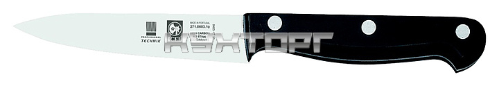 Нож для чистки овощей ICEL Technik Paring Knife 27100.8603000.100 оснащен эргономичной ручкой черного цвета из полиоксиметилена, устойчивого к высоким температурам, и заточенным вручную лезвием, выполненным из высококачественной нержавеющей стали с добавлением хрома, молибдена и ванадия. Твердость стали, закаленной по специальной технологии, составляет более 56 HRC. Ручка соединена с лезвием посредством заклепок из нержавеющей стали.