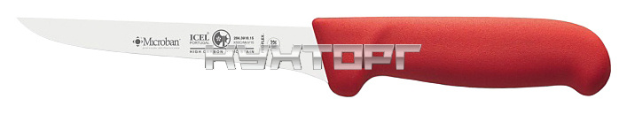Обвалочный нож ICEL Safe Boning Knife 28400.3918000.150 оснащен эргономичной ручкой красного цвета из приятного на ощупь пластика Proflex, устойчивого к высоким температурам и воздействию агрессивных элементов, и заточенным вручную лезвием, выполненным из высококачественной нержавеющей стали с добавлением хрома, молибдена и ванадия. Твердость стали, закаленной по специальной технологии, составляет более 56 HRC. Ручка, изготовленная по системе инжекции, имеет специальную антибактериальную защиту Microban.