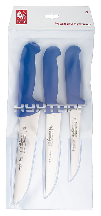 Набор ножей для мяса ICEL 3 Butcher Knives Set 48300.BS02000.003 состоит из 3 ножей разного размера, каждый из которых оснащен эргономичной ручкой синего цвета из приятного на ощупь пластика Proflex, устойчивого к высоким температурам и воздействию агрессивных элементов, и заточенным вручную лезвием, выполненным из высококачественной нержавеющей стали с добавлением хрома, молибдена и ванадия. Твердость стали, закаленной по специальной технологии, составляет более 56 HRC. Ручка, изготовленная по системе инжекции, имеет специальную антибактериальную защиту Microban.