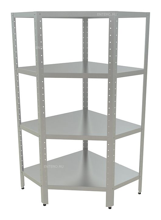 Угловой кухонный стеллаж Кобор СКУ-4/3-90/100 предназначен для хранения посуды, различного инвентаря и сухих продуктов на предприятиях общественного питания и торговли. Модель оснащена сплошными полками. Разборный каркас выполнен из уголка из оцинкованной стали, полки - из нержавеющей стали AISI 430.