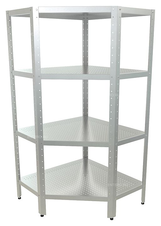 Угловой кухонный стеллаж Кобор СКПУ-5/3-80/100/430 предназначен для хранения посуды, различного инвентаря и сухих продуктов на предприятиях общественного питания и торговли. Модель оснащена перфорированными полками. Разборный каркас выполнен из уголка из нержавеющей стали AISI 430, полки - из нержавеющей стали AISI 430.