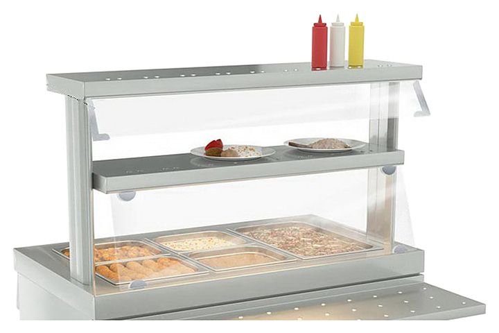 Козырек ATESY Ривьера используется на предприятиях общественного питания и торговли совместно с двух- и трехъярусными полками одноименной линии раздачи питания. Козырек позволяет защитить продукты и готовые блюда от попадания посторонних частиц и пыли.