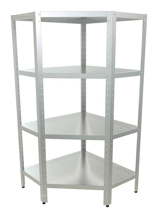 Угловой кухонный стеллаж Кобор СКПУ-5/3-80/100 предназначен для хранения посуды, различного инвентаря и сухих продуктов на предприятиях общественного питания и торговли. Модель оснащена перфорированными полками. Разборный каркас выполнен из уголка из оцинкованной стали, полки - из нержавеющей стали AISI 430.