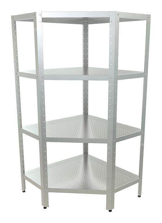 Угловой кухонный стеллаж Кобор СКПУ-5/5-100/100 предназначен для хранения посуды, различного инвентаря и сухих продуктов на предприятиях общественного питания и торговли. Модель оснащена перфорированными полками. Разборный каркас выполнен из уголка из оцинкованной стали, полки - из нержавеющей стали AISI 430.