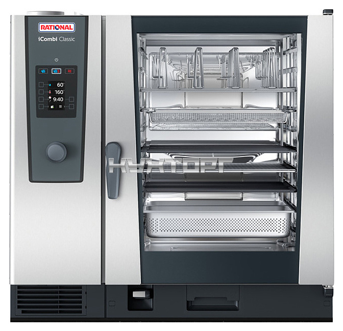 Пароконвектомат Rational iCombi Classic 10-2/1 предназначен для приготовления блюд путём жарки, тушения или варения на предприятиях общественного питания и торговли. Такое оборудование может заменить плиту, жарочный и духовой шкаф, конвекционную печь, опрокидывающуюся сковороду, пищеварочный котел и др. Модель оснащена цветным TFT-дисплеем с мягкими кнопками и поворотным регулятором с функцией Push.