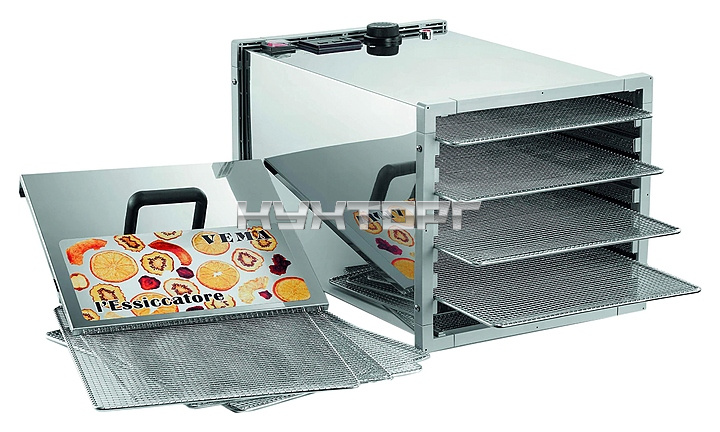 Дегидратор Vema EC 2103/4 используется на предприятиях общественного питания и торговли, в производственных цехах, а также в домашних условиях для сушки овощей, грибов, фруктов и ягод. Модель оснащена электромеханической панелью управления. Корпус выполнен из нержавеющей стали.