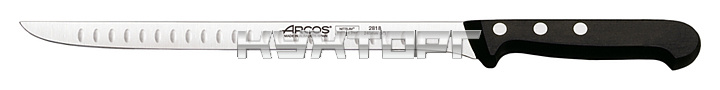 Нож для окорока Arcos Universal Slicing Knife 281801 оснащен удобной ручкой из полиоксиметилена, устойчивого к перепаду температур и воздействию чистящих средств, и лезвием, выполненным из эксклюзивной нержавеющей стали NITRUM, отличающейся повышенной прочностью. Ручка соединена с лезвием посредством специальных заклепок из нержавеющей стали, обладающих повышенной коррозионной стойкостью.