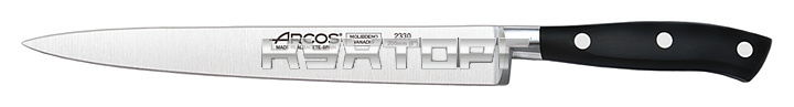 Нож для филе Arcos Riviera Fillet Knife 233000 оснащен удобной ручкой из полиоксиметилена, устойчивого к перепаду температур и воздействию чистящих средств, и цельнокованным лезвием, выполненным из эксклюзивной нержавеющей стали NITRUM, отличающейся повышенной прочностью. Ручка соединена с лезвием посредством специальных шпунтованных заклепок из нержавеющей стали, обладающих повышенной коррозионной стойкостью.