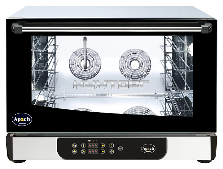 Конвекционная печь Apach AD46DI ECO предназначена для выпекания или разогрева кондитерских и хлебобулочных изделий, готовых блюд, замороженных или предварительно выдержанных в расстоечном шкафу заготовок из теста на предприятиях общественного питания и торговли. Подсветка камеры осуществляется галогеновой лампой. Корпус выполнен из нержавеющей стали, дверца - из двойного закаленного стекла.