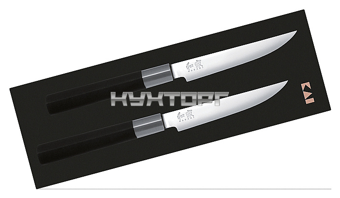 Набор из 2-х ножей для стейков KAI 67S-400 для использования в домашних условиях. Полированные лезвия серии Wasabi Black изготовлены из инновационной коррозионностойкой стали 6A/1K6 с высоким содержанием хрома, чёрная пластиковая рукоятка с добавлением бамбукового порошка.