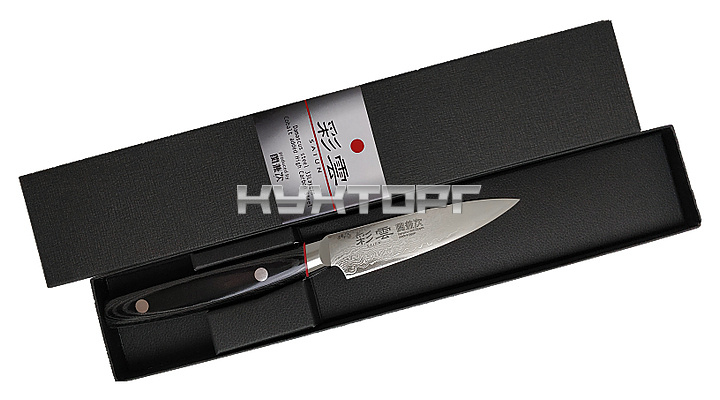 Овощной нож Kanetsugu 9000 предназначен для чистки овощей и фруктов. Этот нож с ламинированными лезвиями создан по традиционной японской технике, с обкладками дамасской стали VG-10. На лезвие нанесены узоры дамасских обкладок в количестве 33 последовательных слоёв никелевых сплавов и нержавеющей стали. Рукоять клёпанная, посажена на прочный хвостовик, выполнена из устойчивой к коррозии стали, украшена накладками из не гниющего пластика.
