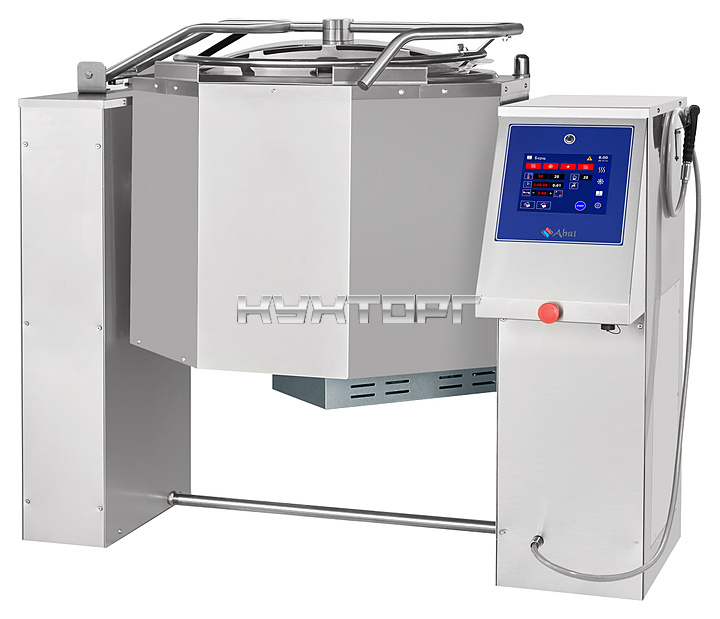Варочный котел Abat КПЭМ-100-ОМП-В с функциями опрокидывания, перемешивания и охлаждения предназначен для приготовления вторых и третьих блюд, бульонов, соусов и десертов, а также для кипячения воды на предприятиях пищевой промышленности и общественного питания. Модель оснащена панелью управления с электронным TFT-экраном и пультом программного управления.