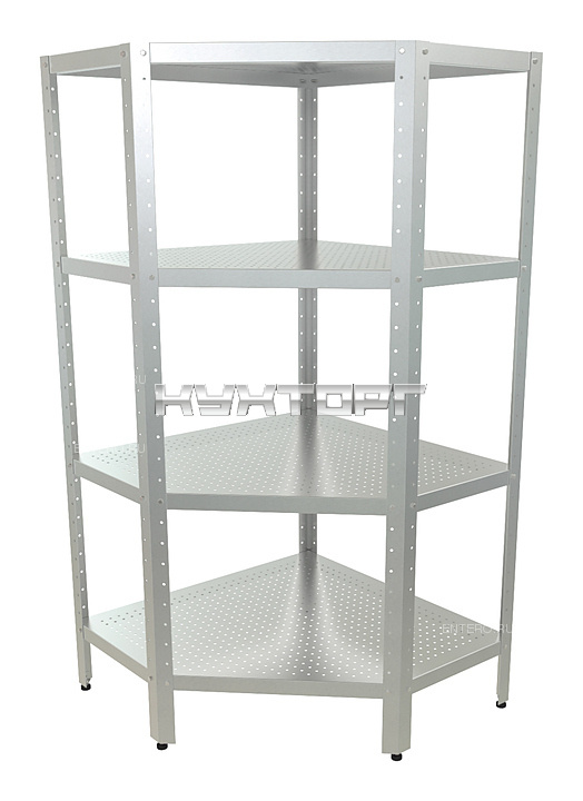 Угловой кухонный стеллаж Кобор СКПУ-6/5-90/100/430 предназначен для хранения посуды, различного инвентаря и сухих продуктов на предприятиях общественного питания и торговли. Модель оснащена перфорированными полками. Разборный каркас выполнен из уголка из нержавеющей стали AISI 430, полки - из нержавеющей стали AISI 430.