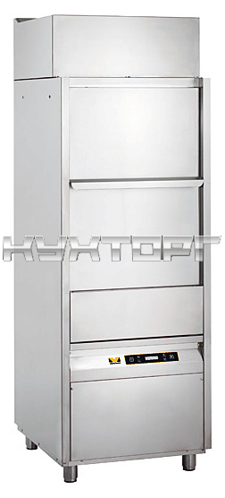 Котломоечная машина Vortmax PWE 782P используется на предприятиях общественного питания и торговли для мойки больших кастрюль, тарелок, стаканов, бокалов, столовых приборов, а также гастроемкостей и противней. Оборудование подключается к горячей воде. Модель с электронной панелью управления оснащена цельнотянутой ванной со скругленными углами, дозаторами моющего и ополаскивающего средств, атмосферным бойлером, ополаскивающей помпой и двойными стенками для термо- и шумоизоляции. Моечные рукава выполнены из нержавеющей стали.