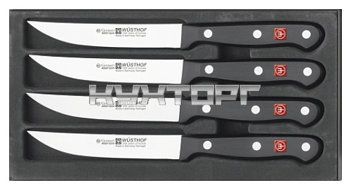Набор кухонных ножей Wüsthof Gourmet 9728 предназначен для нарезки стейков на предприятиях общественного питания и торговли, а также в частных домах и квартирах. Лезвия изготовлены из прокатной нержавеющей молибден-ванадиевой стали X50CrMoV15, отличающейся высочайшим уровнем прочности, повышенной стойкостью к коррозии и оптимальной твердостью, рукоять - из термопластичного износостойкого полиоксиметилена, устойчивого к воздействию разницы температур, кислотам и щелочи.