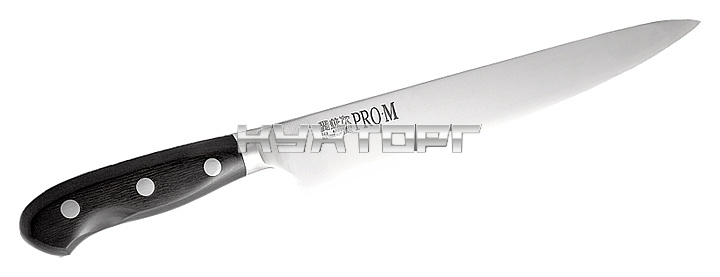 Нож для нарезки слайсер Kanetsugu 7009 предназначен для тонкой нарезки на порционные кусочки. Рукоять выполнена из коррозионностойкой стали, которую обрамляют защитные накладки из не гниющего пластика. Лезвие изготовлено из среднеуглеродистой высоколегированной нержавеющей стали DSR1K6 с добавлением молибдена и ванадия, которая полностью устойчива к коррозии.
