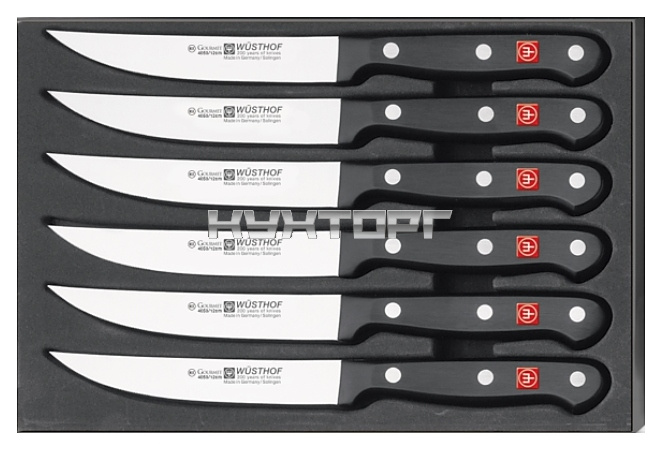 Набор кухонных ножей Wüsthof Gourmet 9728 предназначен для нарезки стейков на предприятиях общественного питания и торговли, а также в частных домах и квартирах. Лезвия изготовлены из прокатной нержавеющей молибден-ванадиевой стали X50CrMoV15, отличающейся высочайшим уровнем прочности, повышенной стойкостью к коррозии и оптимальной твердостью, рукоять - из термопластичного износостойкого полиоксиметилена, устойчивого к воздействию разницы температур, кислотам и щелочи.