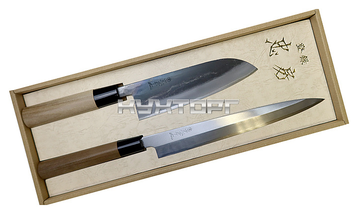 Набор ножей Tadafusa setA предназначен для работы в домашних условиях и на предприятиях общественного питания. В набор входят нож сантоку и нож янагиба. Лезвия ножей выполнены из высокопрочной стали Shirogami, рукоятка - из влагоустойчивого пластика.