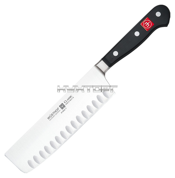 Кухонный нож Nakiri Wüsthof Classic 4193 предназначен для резки овощей и фруктов на предприятиях общественного питания и торговли, а также в частных домах и квартирах. Изделие выполнено из кованой нержавеющей молибден-ванадиевой стали X50CrMoV15, отличающейся высочайшим уровнем прочности, повышенной стойкостью к коррозии и оптимальной твердостью, ручка - из термопластичного износостойкого полиоксиметилена, устойчивого к воздействию разницы температур, кислотам и щелочи.