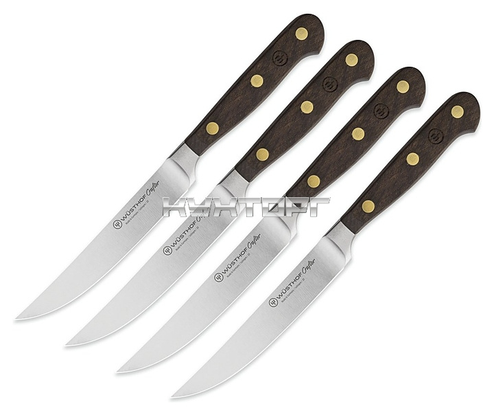 Набор кухонных ножей Wüsthof Crafter 9738 предназначен для нарезки стейков на предприятиях общественного питания и торговли, а также в частных домах и квартирах. Ножи выполнены из кованой нержавеющей молибден-ванадиевой стали X50CrMoV15, отличающейся высочайшим уровнем прочности, повышенной стойкостью к коррозии и оптимальной твердостью, рукояти - из древесины дуба, обладающей высокой степенью износостойкости и невосприимчивости к воздействию влаги или слабых соляных растворов. Клинки изделий изготовлены из цельного куска нержавеющей стали, а деревянные накладки на полный хвостовик - из прочного копченого дуба, который устойчив к воздействию влаги, пищевых соков, а также рассыханию. К стальной основе плашки крепятся латунными заклепками.