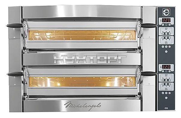 Печь для пиццы Cuppone Michelangelo ML635L/2CD используется на предприятиях общественного питания и торговли. Модель оснащена 2 цифровыми панелями управления, 2 дверями с двойными обзорными стеклами и освещением камер выпекания 2 галогенными лампами. Фасад и камеры выпекания выполнены из нержавеющей стали.